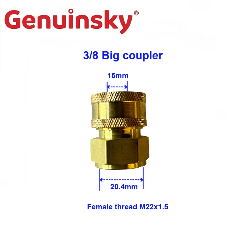 Genuinsky 3/8 Big Coupler, kroppen är tillverkad av allt koppar, och mässingsmaterial har stora fördelar med korrosionsbeständighet. Den ena änden av produkten är kvinnlig tråd M22 × 1,5, med en inre diameter på 20,4 mm, utrustad med en tätningsbricka, som kan användas med ståltrådflätade rör och högtrycksslangar med motsvarande specifikationer.