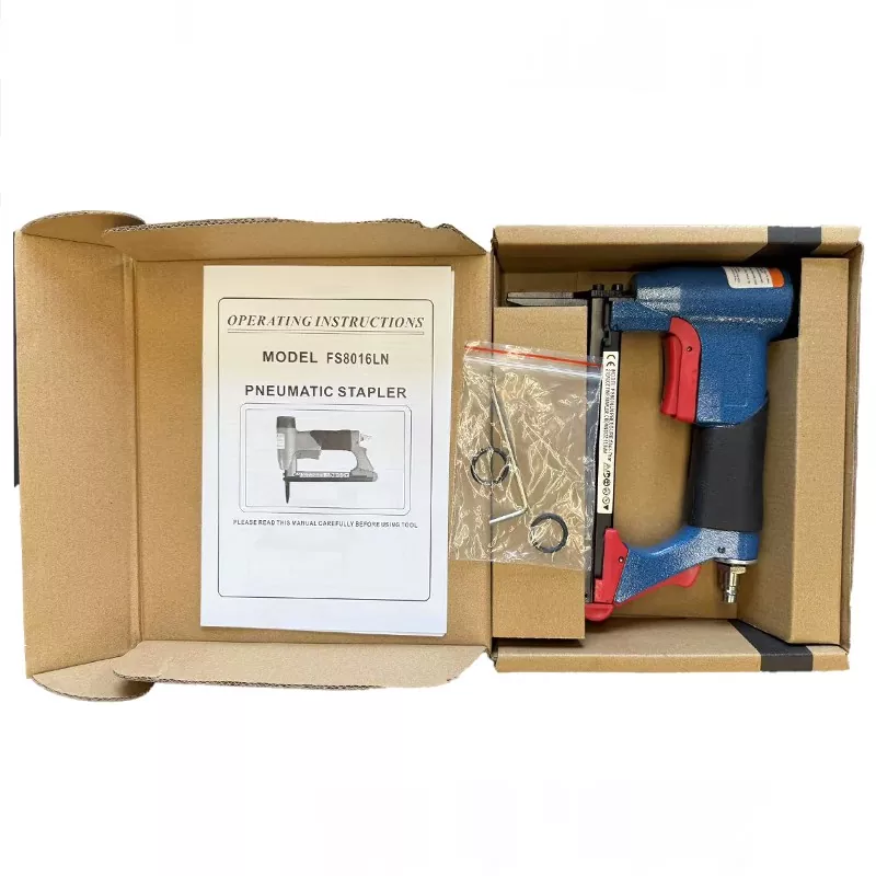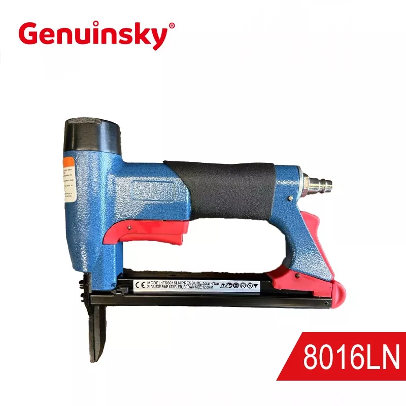 8016LN (Long Nose) Luft Fine Crown Stapler tillhör 8016 Series Stapler, som har lång näsa för att passa speciell användning. Den långa näsdesignen kan sträcka sig i smala utrymmen, undvika förskjutning, säkerställa exakt och stabil drift och hög effektivitet. Själlen brukade fixa U-formade naglar eller dörrspikar på ytan på material genom pneumatiska enheter som luftkompressorer. Det används huvudsakligen för bearbetning och tillverkning av soffa tyger eller lädermaterial och för snabb batchbearbetning av materialskärning. Det är ett viktigt verktyg för läderbearbetningsfabriker och möbelfabriker.