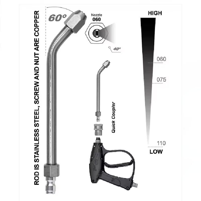 Storleksdesignen för detta böjda munstycke är korrekt, böjt 60 grader, med utformningen av utloppshålet Dia.060 40 grader, denna speciella hörndesign kan lätt nå in i det smala inre utrymmet för luftkonditioneringsapparaten för rengöring. Operationen kan vara mycket flexibel. Munstycksspecifikationen är 060, och munstyckets vinkel är 40 grader, så att den kan bilda ett lämpligt vattenflöde för spolning i rengöringsoperationen. Nilfisk och WAP är mycket kända märken av rengöringsutrustning. Dessa två varumärken av tvättpistol har stabilt vattenflöde med högt tryck och kan noggrant kontrollera rengöring, så de används allmänt i rengöring av arbetet i många scenarier. Genuinskys böjda munstycke passar WAP/Nilfisk Gun, så det kan bekvämt rengöra luftkonditioneringsapparaten med samarbete mellan båda parter och kan rengöra dammet och smuts inuti luftkonditioneringsapparaten mer effektivt. Rengöring i tid är inte bara för människor är det bra för hälsan och kan också förlänga livslängden för själva luftkonditioneringen.