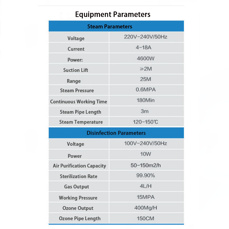 Dettamaskinär utrustad med en professionell bärbar skyddslåda, utrustad med olika rörledningar, bekväm förvaring, lämplig för rengöring och desinfektion, bilrengöring, catering och hotell och andra relaterade scenarier. Maskinen kan användas för flera ändamål, eftersom den har funktioner som ånga, desinfektion, kallt och varmt vatten, puls etc. med stark prestanda och flexibel användning. Låt oss först introducera några funktionella data. Först, ångfunktion, spänningen är anpassad till 220V - 240V/50Hz, kraften är 4600W, sugområdet är ≥2 m, actionområdet är 25 m, ångtemperaturen är 120 - 150 ℃ ℃ ℃ ℃ ℃ ℃ ℃ ℃ ℃ ℃ ≥ ≥ ≥ 2 mekan är det, det är 3 -mätare, det är långa ångpipan och det är långt på att det är långt på att det är långt på att det är långt och är lätt att ta bort en borgen och det är lätt att ta bort den som är långa på. Damm med hjälp av hög temperatur ånga. Second, disinfection function, the voltage is adapted to 100V - 240V/50Hz, the power is 10W, the air purification capacity is 50 - 150m²/h, the sterilization rate is as high as 99.90%, the gas output is 4L/H, the working pressure is 15MPA, and the ozone output is 400Mg /H, the 150-cm-long ozone tube can fully cover the disinfection area, och ångtemperaturen vid 120-150 ℃ kan effektivt genomföra steriliseringsaktiviteter och kan döda alla slags bakterier eller kvalster.