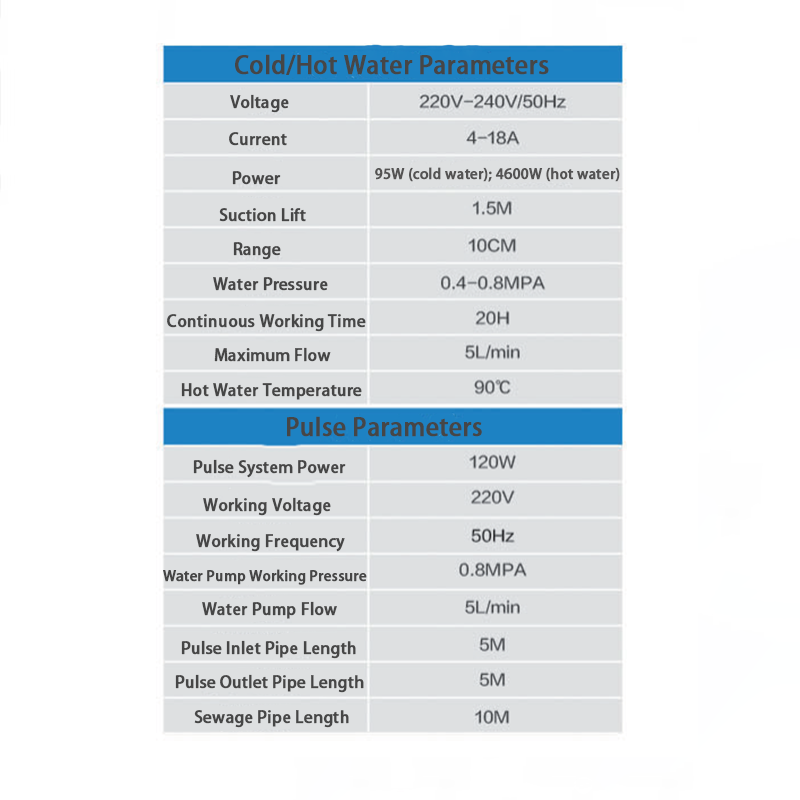 Third, cold and hot water switching function, the voltage is adapted to 220V - 240V/50Hz, the cold water power is 95W, the hot water power is 4600W, the suction range is 1.5M, the range is 10CM, the water pressure is 0.4 - 0.8MPA, which can withstand up to 20 hours of work, the most Large flow rate 5L/min, hot water temperature up to 90℃, meeting the cleaning needs of different Vattentemperaturer, varmvattenläge eller kallt vattenläge kan växlas enligt olika användningsscenarier. För det fjärde, pulsfunktionen. Kraften hos pulssystemet är 120W, arbetsspänningen är 220V, frekvensen är 50Hz, pumpens arbetstryck är 0,8 MPa, flödeshastigheten är 5L/min, pulsinloppsröret och utloppsröret är 5 meter och avloppsröret är upp till 10 meter, vilket är till stor hjälp.