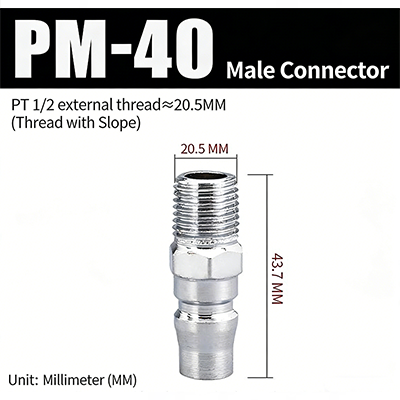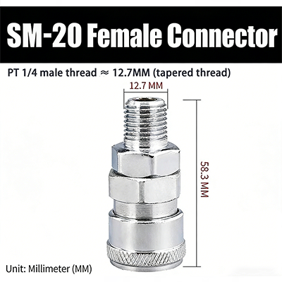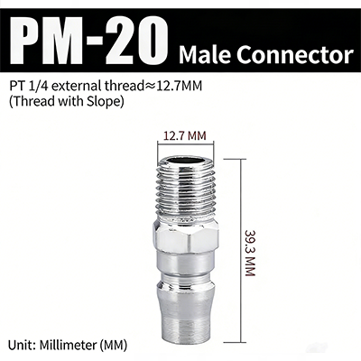 1. PM-20. PT 1/4 hangänga ,Den gängade delens diameter är 12,7 mm, och produktens totala längd är 39,3 mm.