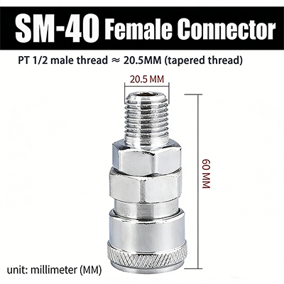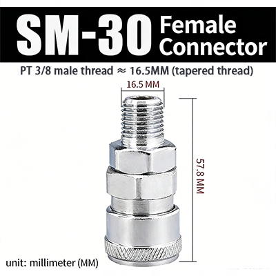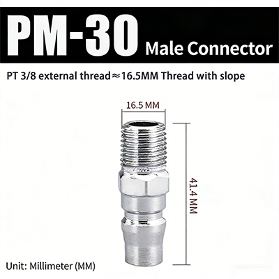PM–SM-serien C-typ snabbkopplingar med JIS PT-gänga har en snabbpluggsstruktur av C-typ. Han- och honhuvudena kan matchas efter behag och det kan kopplas in och anslutas, vilket är väldigt bekvämt. Förbandet antar ytbehandling av elektroplätering, med den inre kopparkärnan, som inte bara är korrosionsbeständig, utan också slitstark, vilket förbättrar fogens hållbarhet och förlänger livslängden.