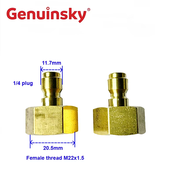 Denna produkt är en snabb plugg 1/4 tum kvinnlig tråd M22-kontakt, med en 1/4 plugg i ena änden, med en diameter på 11,7 mm, och en kvinnlig tråd M22 × 1,5 i den andra änden, med en diameter på 20,5 mm, som är lämplig för rengöringsutrustning för högtrycksbrickor.