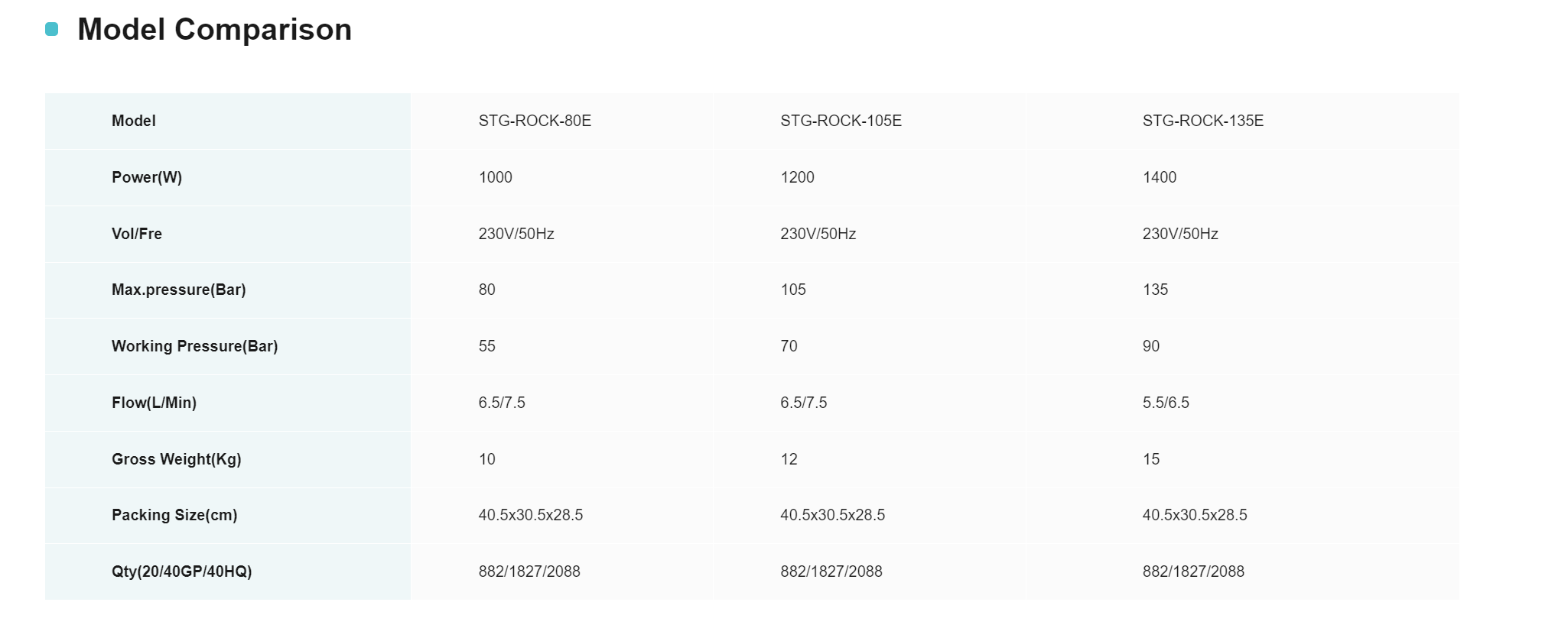 STG-ROCK-E Bärbar högtryckstvätt är uppdelad i tre modeller, nämligen STG-ROCK-80E, STG-ROCK-105E och STG-ROCK-135E. Strömförsörjningsspecifikationerna för de tre modellerna är alla 230V/50Hz, och förpackningsstorleken är också enhetligt 40,5×30,5×28,5 cm. Antalet lådor för högskåp är också detsamma. Antalet lådor för 20 fot höga skåp är 882 enheter, antalet lådor för 40GP högskåp är 1827 enheter och antalet lådor för 40HQ högskåp Antalet lådor är 2 088 enheter.