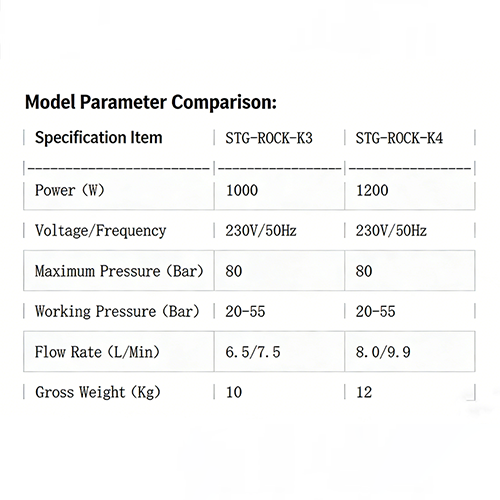 Först av allt, jämför några prestandaparametrar för K3 och K4. Båda modellerna är utrustade med högtryckspumpar av aluminiumlegering. Fördelarna med detta material är korrosionsbeständighet, hållbarhet och hög prestanda. Samtidigt har de båda lågbrusiga induktionsmotorer. Skillnaden är att effekten av K3 är 1000W och effekten av K4 är 1200W, vilket är lågt brus samtidigt som den körs effektivt. , är det inte lätt att orsaka grannkonflikter i hemmets scenarier. Båda modellernas spänning/frekvens är 230V/50Hz, det maximala trycket är 80Bar och arbetstrycket kan nå 20-55Bar. Skillnaden är att flödeshastigheten för K3-modellen är 6,5/7,5 l/min, och flödeshastigheten för K4-modellen är 8,0/9,9 l/min.