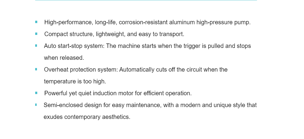 För det andra antar STG-ROCK-K bärbara högtryckstvätt en kompakt struktur som helhet och den totala kroppsvikten är mycket lätt. Nettovikten för K3 är 10 kg, och nettovikten för K4 är 12 kg, som båda är utrustade med handtagsdesignen upptill, vilket är bekvämt. Användare kan flytta efter sina städbehov, från hemmet till utomhus. Samtidigt är enheten också utrustad med intelligenta funktioner för automatiskt start-stopp och överhettningsskydd. Dra i avtryckaren på sprutpistolen för att starta och släpp avtryckaren för att stanna. Ingen manuell omkopplare krävs, vilket gör operationen mer bekväm. Överhettningsskydd gör att enheten automatiskt kan stänga av kretsen när temperaturen är för hög, undvika överbelastning som orsakar skador på maskinen, förbättra den övergripande säkerheten och göra produkten säkrare och mer bekymmersfri under användning. Den halvstängda designen av flygkroppen är också mycket humaniserad, vilket är bekvämt för dagligt underhåll och kan enkelt kontrollera delar och rengöra filtret.