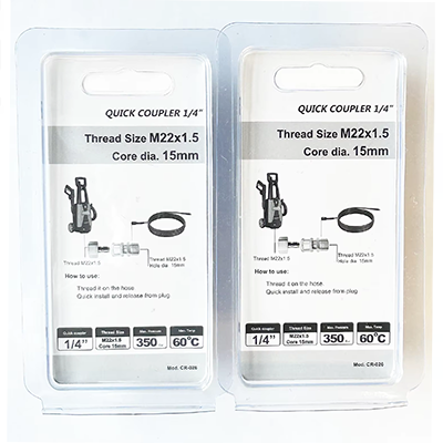 1/4 kopplingen av dessa två specifikationer har olika storleksdesign. En är M22 × 1,5, med en diameter på 22 mm, varav kärnan dia.15mm. Den andra är M14 × 1,5, med en diameter på 14 mm och ett avsmalnande hål. Utformningen av de två storleken på produkten är mycket exakt, vilket kan anpassas exakt till relevanta matchande rengöringsmaskiner och användas för högtryckstvättpistolslanganslutningar. Materialet i själva produkten är mässing. Mässingsmaterialet har god korrosionsmotstånd. Högtrycksrengöringsarbete måste ofta möta en fuktig miljö. Därför kan korrosionsmotståndet för själva produkten fungera normalt i många hårda arbetsmiljöer. Samtidigt har mässing god duktilitet och hårdhet, och i högtrycksvattenflödet kan produktens hållbarhet också upprätthållas i påverkan, och det är inte lätt att bryta, och därmed orsaka vattenläckage och minska kostnaderna för att ersätta utrustningen. Kommonbruksscenarier inkluderar hemrengöring, rengöring av industriell utrustning eller utomhusanläggning. Under dessa rengöringsprocesser kan installation eller demontering genomföras snabbt. Användare kan snabbt slutföra anslutningsarbetet utan hjälp av verktyg, vilket förbättrar arbetseffektiviteten kraftigt och sparar tid. Samtidigt är storleken på 1/4 kopplingen av dessa två specifikationer också mycket lämpliga. Användare kan enkelt och flexibelt slutföra anslutningsoperationen med en hand.