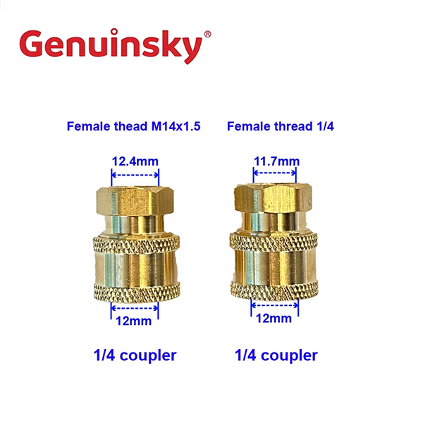 Den här produkten är en två -touch mässingssnabbkopplingskopplare 20 SFA 1/4 "Chuck -adapter. Det finns två modeller, en är den inre tråden M14 × 1,5, med en diameter på 12,4 mm, och den andra är den inre tråden G1/4 tum, med en diameter på 11,7 mm. De är matchade med biltvättar.